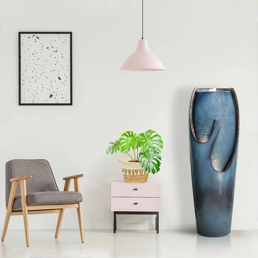 Elevate your space with our 38.7″H Tall Floor Water Jar Fountain. This stunning statement piece combines rustic charm with modern functionality, featuring integrated LED lights for ambient evening glow. Perfect for indoor living rooms or outdoor patios, its gentle, cascading water flow promotes relaxation and masks unwanted noise. Crafted for durability and easy maintenance, this fountain offers a serene oasis for you and your pets. A premium hydration station and decor element in one.